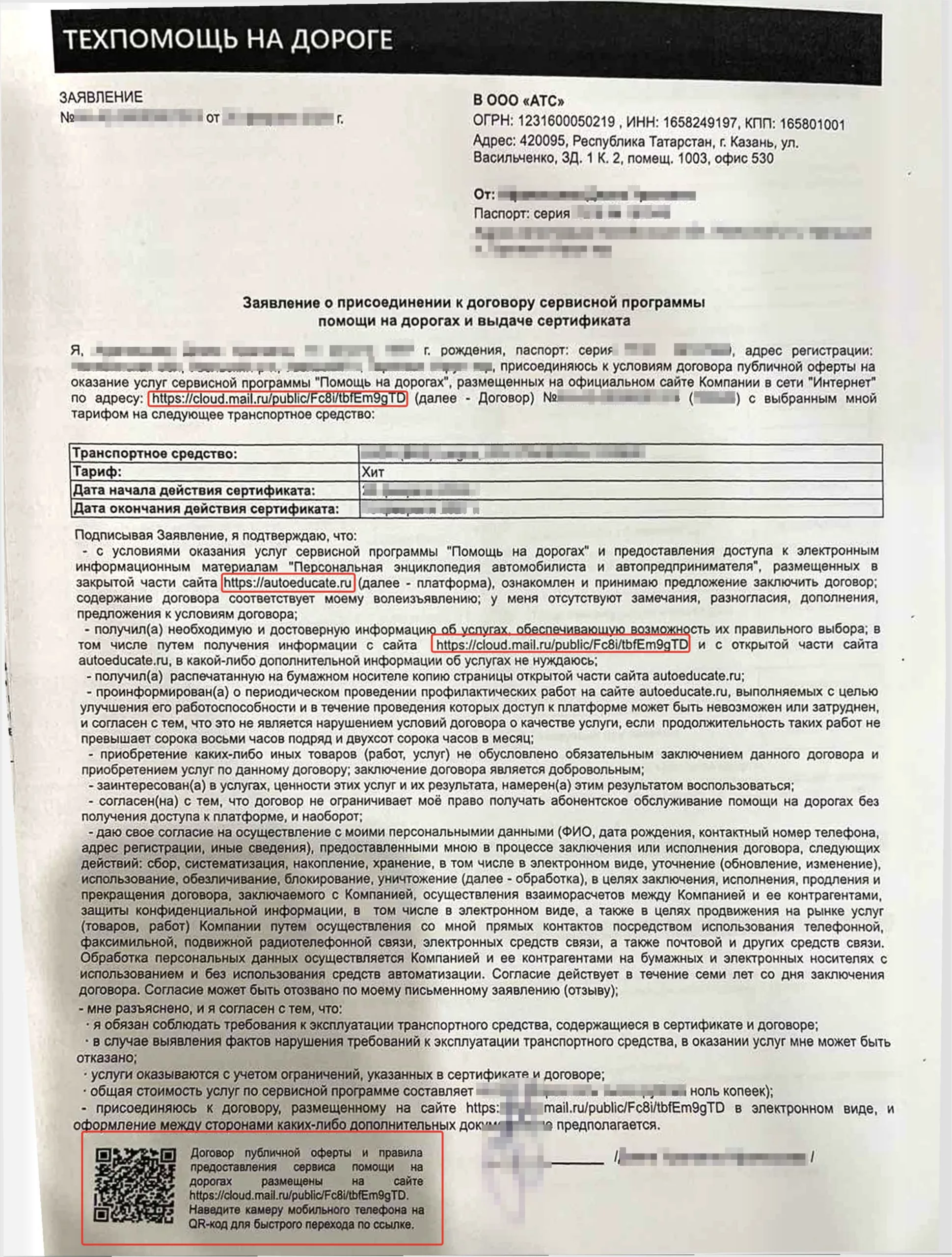 Обратите внимание, в сертификате нет сведений ни о компании, ни о размере стоимости услуг. Эти данные можно взять из Заявления о присоединении к договору сервисной программы помощи на дорогах. На практике это заявление могут не выдать и клиент получает только Сертификат.