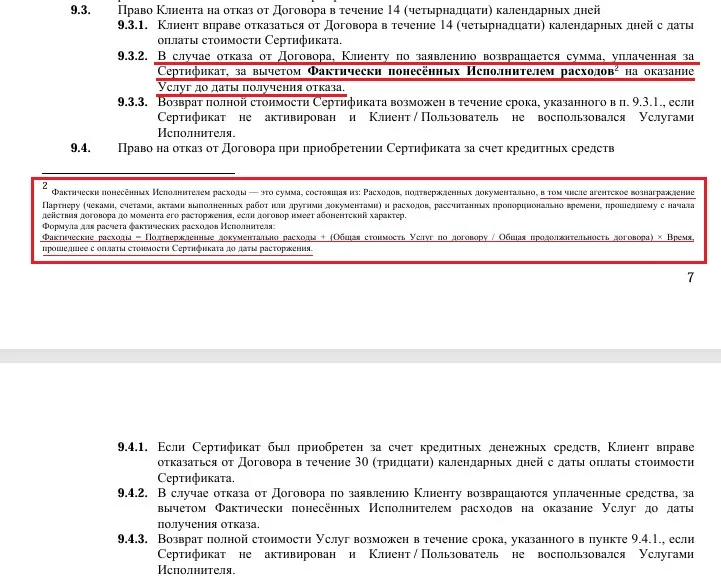 Чаще всего к нам обращаются, когда по заявлению о расторжении компания вернула всего малую часть стоимости договора, отказав в возврате остальных средств со ссылкой на п. 9.3.2 и п. 9.4.2 абонентского договора.