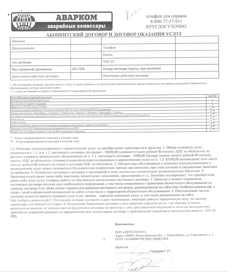 Для того, чтобы вернуть деньги с ООО “Автогарант” за договор Аварком, нужно подать заявление о расторжении по адресу: 630003, Новосибирская обл, г Новосибирск, Железнодорожный р-н, ул Саратовская, д 62. Если с заявлением обратиться в период охлаждения, т.е. в течение 30 дней, получится вернуть всю стоимость оформленной услуги согласно п. 2.7-2.8 ст. 7 N 353-ФЗ «О потребительском кредите».