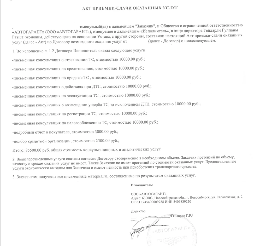 Относительно оставшейся части: согласно акту приемки-сдачи оказанных услуг, ООО “Автогарант” осуществили консультационные и аналитические услуги.
