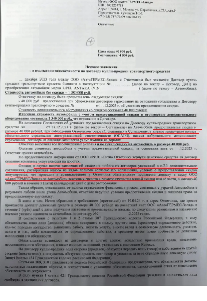 В исковом заявлении автосалон указал, что покупателю была предоставлена скидка в размере 40 000 рублей при условии заключения ряда договоров, в том числе: