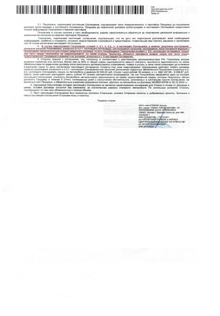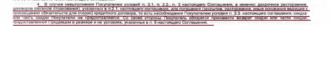 Кроме того, в п. 4 соглашения об условиях предоставления скидки, автосалон ООО «АвтоГЕРМЕС-Запад» указал, что в случае отказа покупателя от какой-либо из указанных в п.2.1, 2.2. услуг, применяется цена автомобиля без учета скидки. Возврат денежных средств за один из таких договоров влечёт аннулирование условия о скидке и обязанность покупателя вернуть все предоставленные скидки в полном объёме.