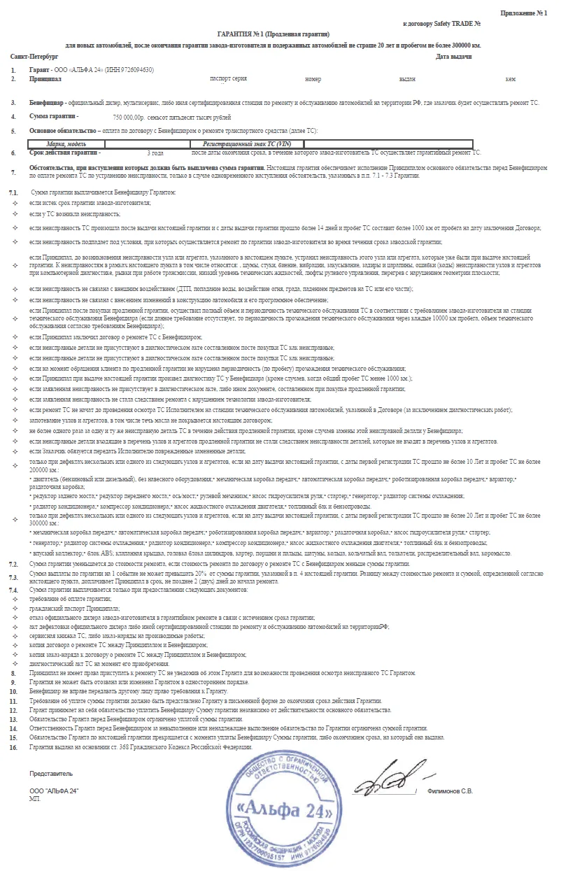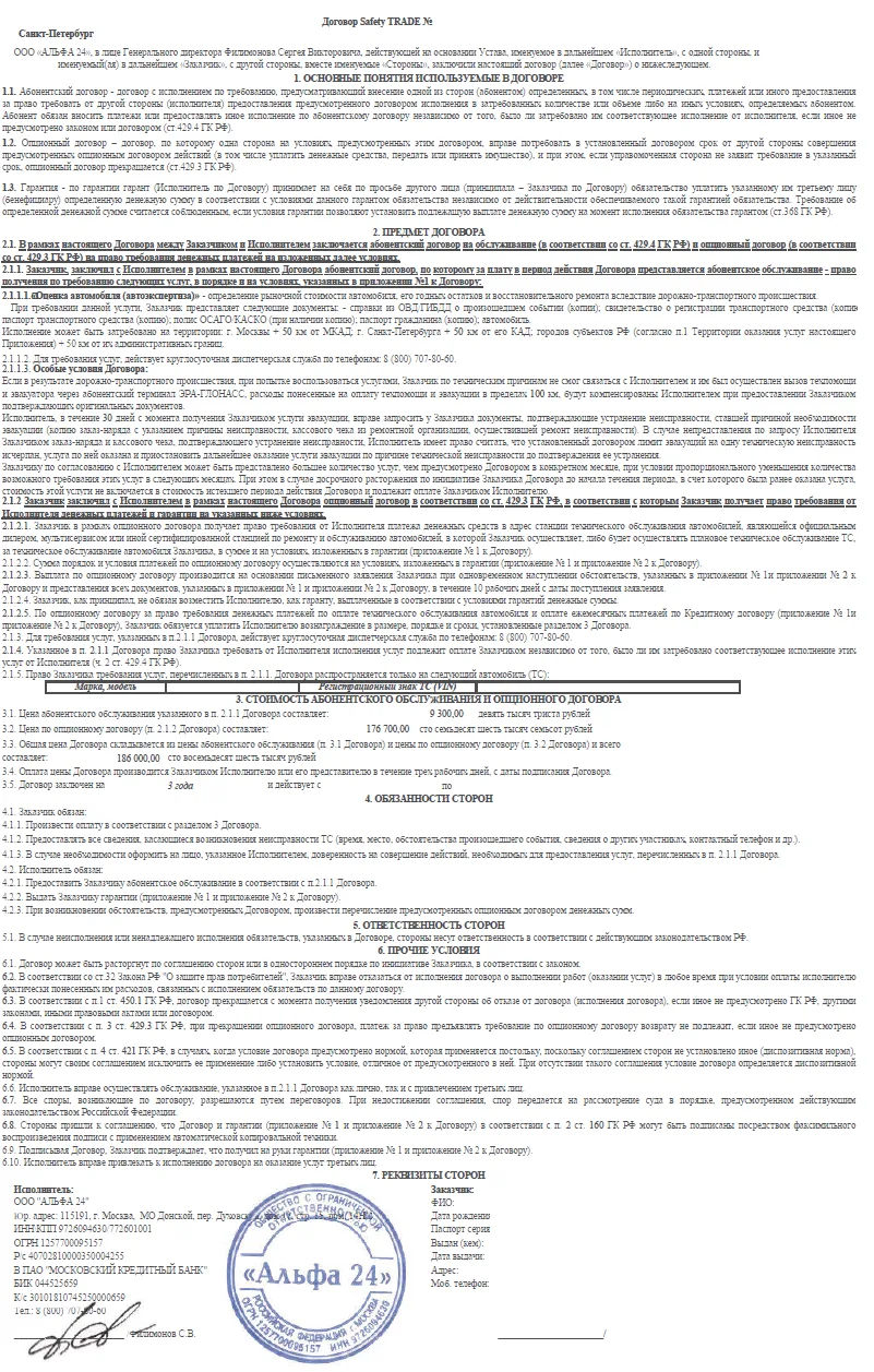 По договору ООО “Альфа 24” обязуется провести оценку автомобиля, а также предоставить услуги помощи на дороге и независимую гарантию на возмещение ремонта автомобиля в определенных СТО. По сути, это смешанный договор, содержаний в себе два предмета: