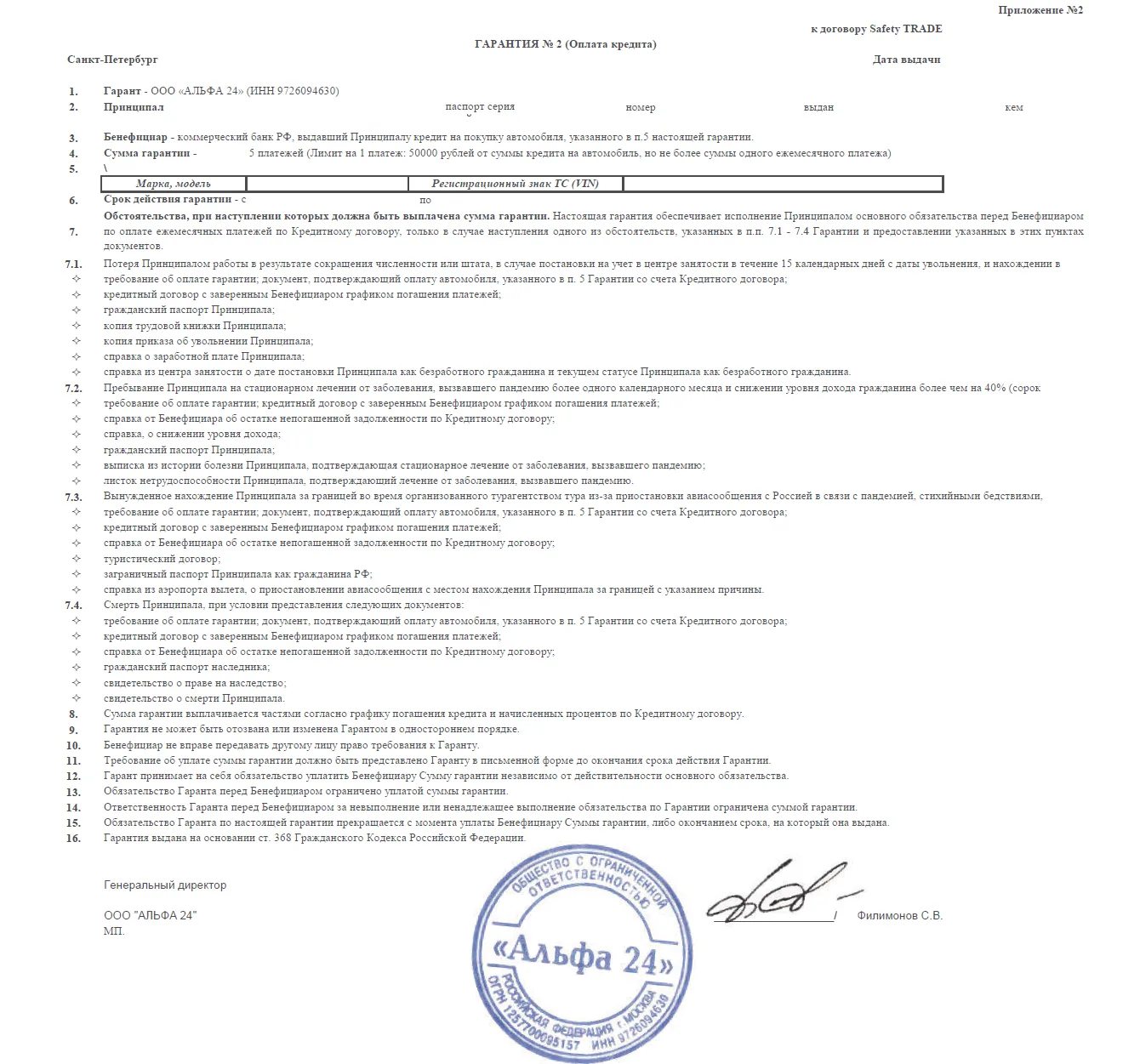 Мы знаем о компании ООО “Альфа 24” только по обращениям клиентов, желающих вернуть деньги за навязанные при покупке автомобиля услуги помощи на дороге и независимой гарантии. О другой деятельности этой компании или о пользе оформленной дополнительной услуги нам не известно.