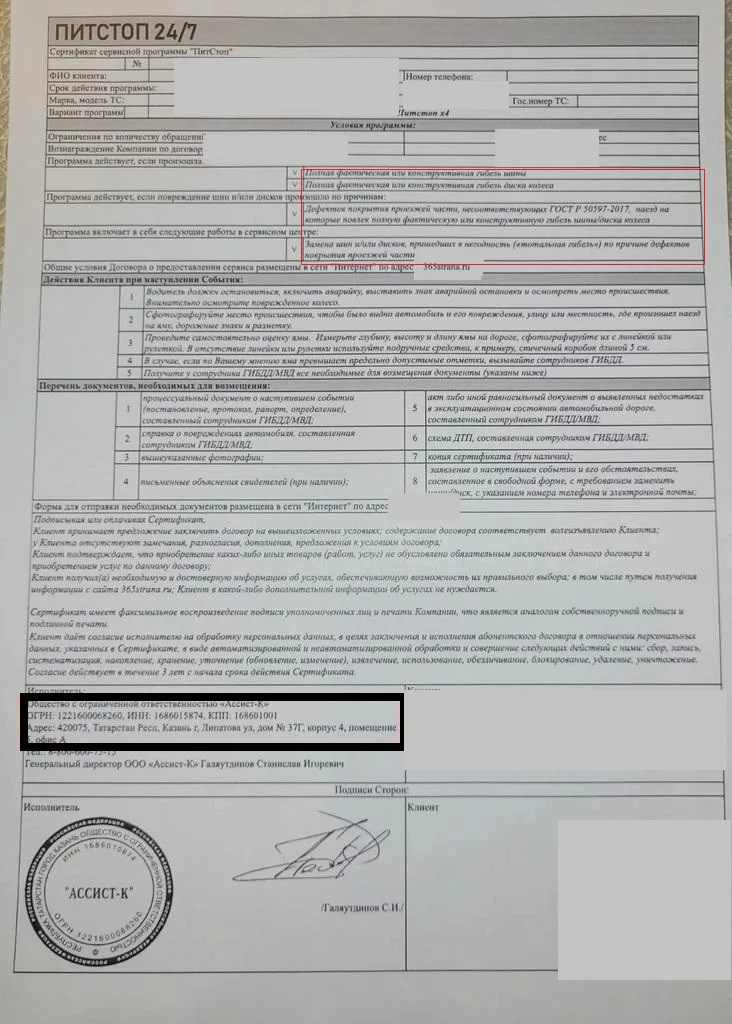 Для того, чтобы вернуть деньги с ООО “Ассист-К” за сертификат сервисной программы ПитСтоп 24/7, нужно подать заявление о расторжении по адресу: 420044, Респ Татарстан, г Казань, Ново-Савиновский р-н, ул Восстания, д 18Б, помещ 1033. Если с заявлением обратиться в период охлаждения, т.е. в течение 30 дней, получится вернуть всю стоимость оформленной услуги согласно п. 2.7-2.8 ст. 7 N 353-ФЗ «О потребительском кредите».