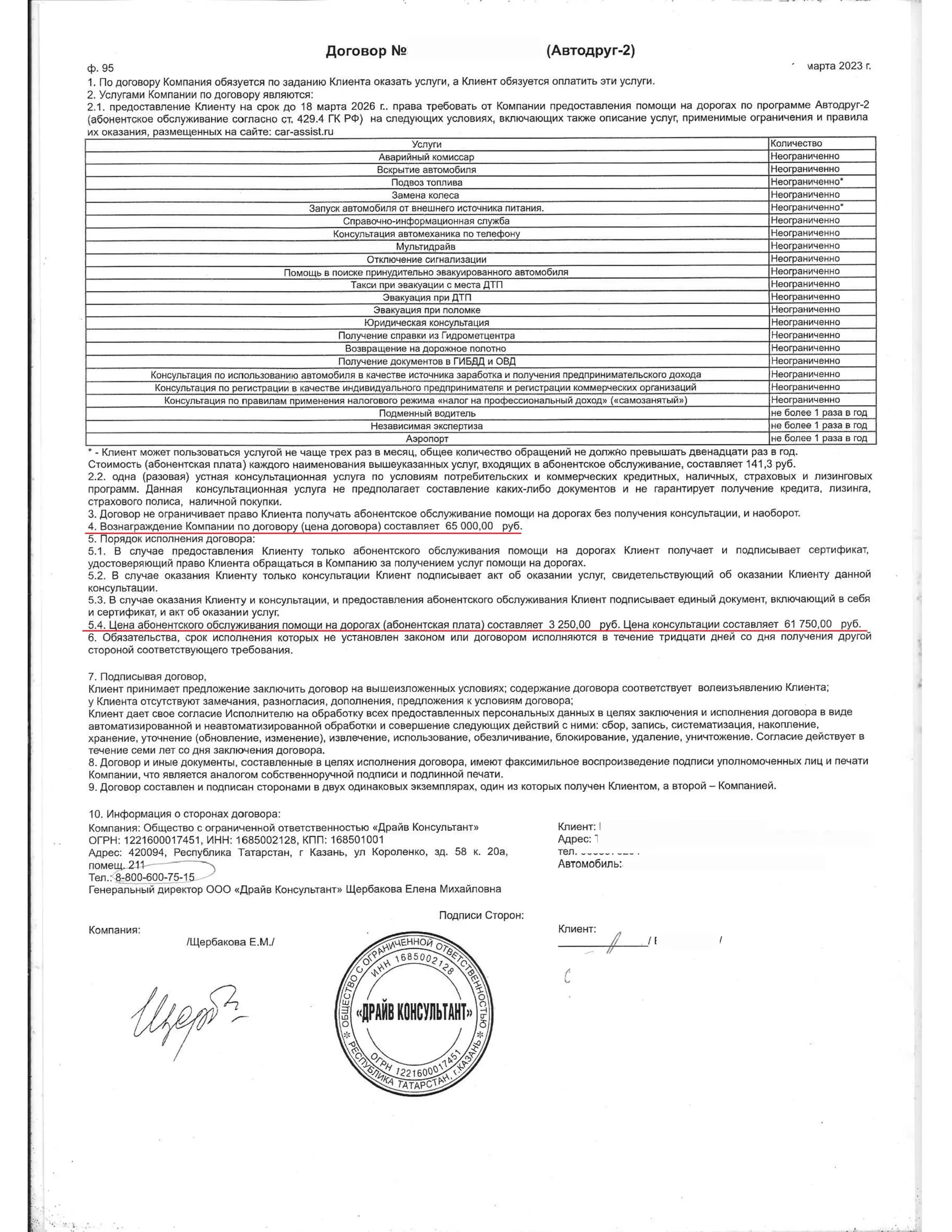 Как видно по документам (см. фото 1) , услуги помощи на дороге составляют меньшую часть – 3 250 рублей стоимости договора. Самая дорогая часть договора – 61 750 руб. – консультация.