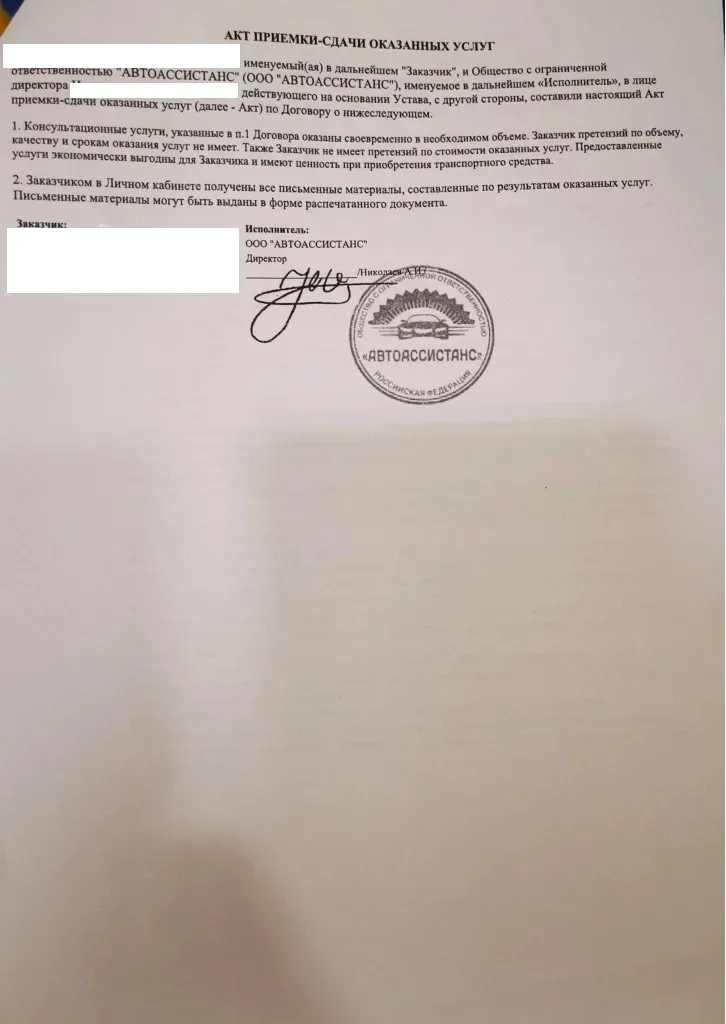 – в регионе оформления кредитования у ООО “Автоассистанс” не было ни филиалов, ни сотрудников, однако акт был подписан директором компании;