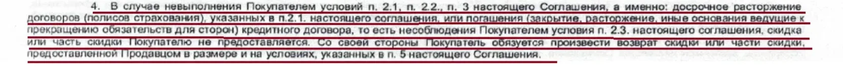 В п.4 дополнительного соглашении указано, что скидка аннулируется в случае досрочного расторжения договоров, указанных в п. 2.1, либо при досрочном полном или частичном погашении кредита. Тем самым покупатель обязан доплатить автосалону ООО «АвтоГЕРМЕС-Запад» сумму аннулированной скидки.