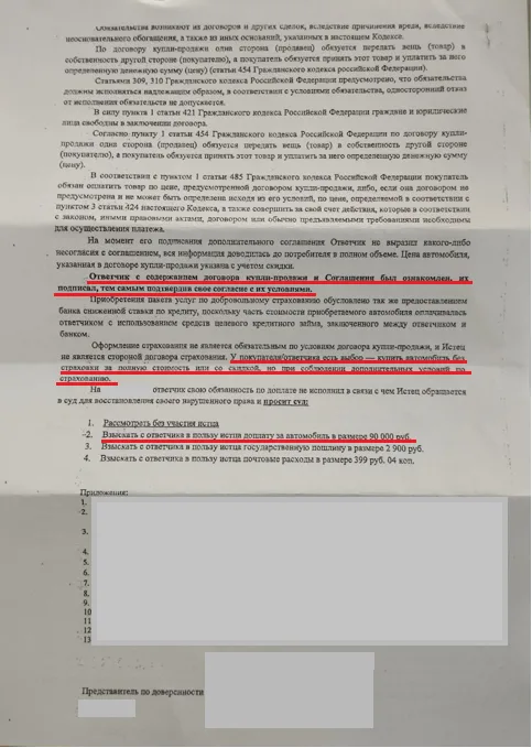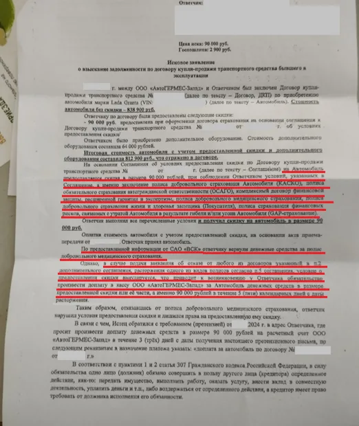 Покупатель не планировал пользоваться полисом добровольного медицинского страхования, поэтому он отказался от полиса САО “ВСК”. После отказа автосалон ООО «АвтоГЕРМЕС-Запад» направило ему претензию с требованием вернуть ранее предоставленную скидку. Впоследствии, автосалон обратился в суд с исковым заявлением. Ниже разберём позицию автосалона, наши доводы и выводы суда.