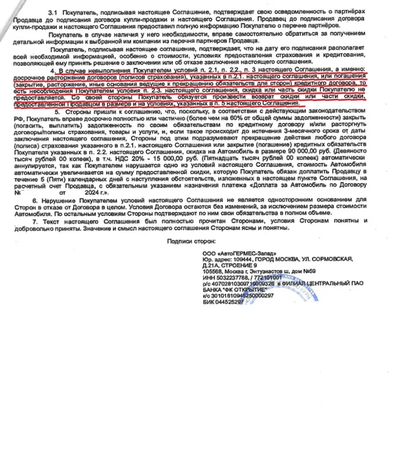 Кроме того, в п. 4 соглашения об условиях предоставления скидки, автосалон ООО «АвтоГЕРМЕС-Запад» указал, что в случае отказа покупателя от какой-либо из указанных в п.2.1, 2.2. услуг, применяется цена автомобиля без учета скидки. Возврат денежных средств за один из таких договоров влечёт аннулирование условия о скидке и обязанность покупателя вернуть все предоставленные скидки в полном объёме.
