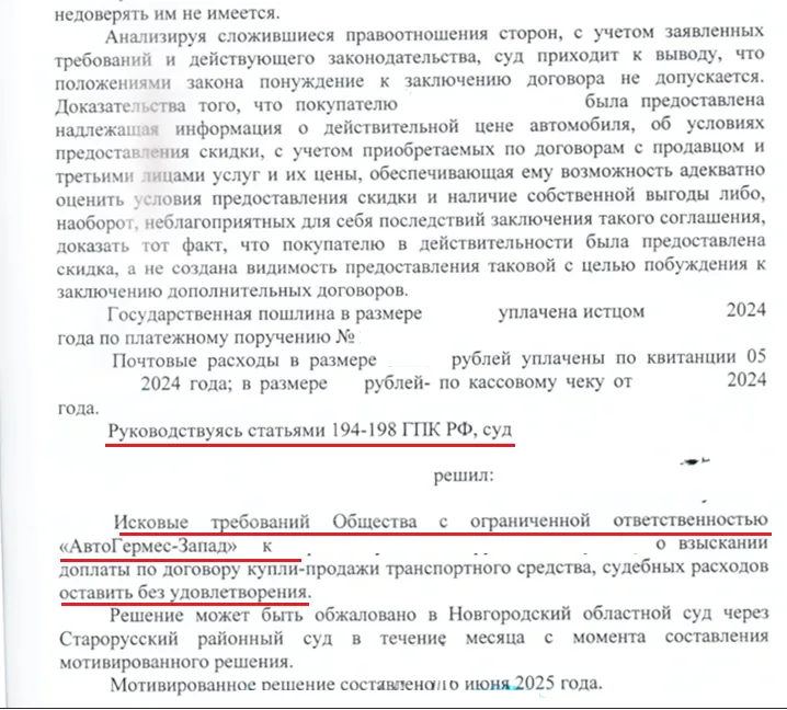 Выиграли суд с автосалоном ООО «АвтоГЕРМЕС-Запад» по взысканию скидки за услуги САО «ВСК»