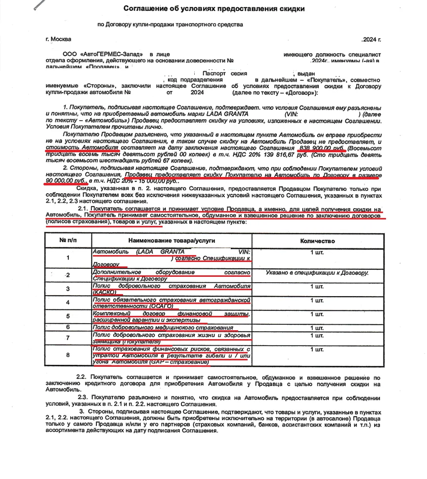 В п.2.1 соглашения об условиях предоставления скидки дилер ООО «АвтоГЕРМЕС-Запад» указал, что покупатель соглашается и принимает условия продавца для получения скидки на автомобиль, а также принимает самостоятельное, обдуманное и взвешенное решение по заключению договоров (полисов страхования), товаров и услуг.