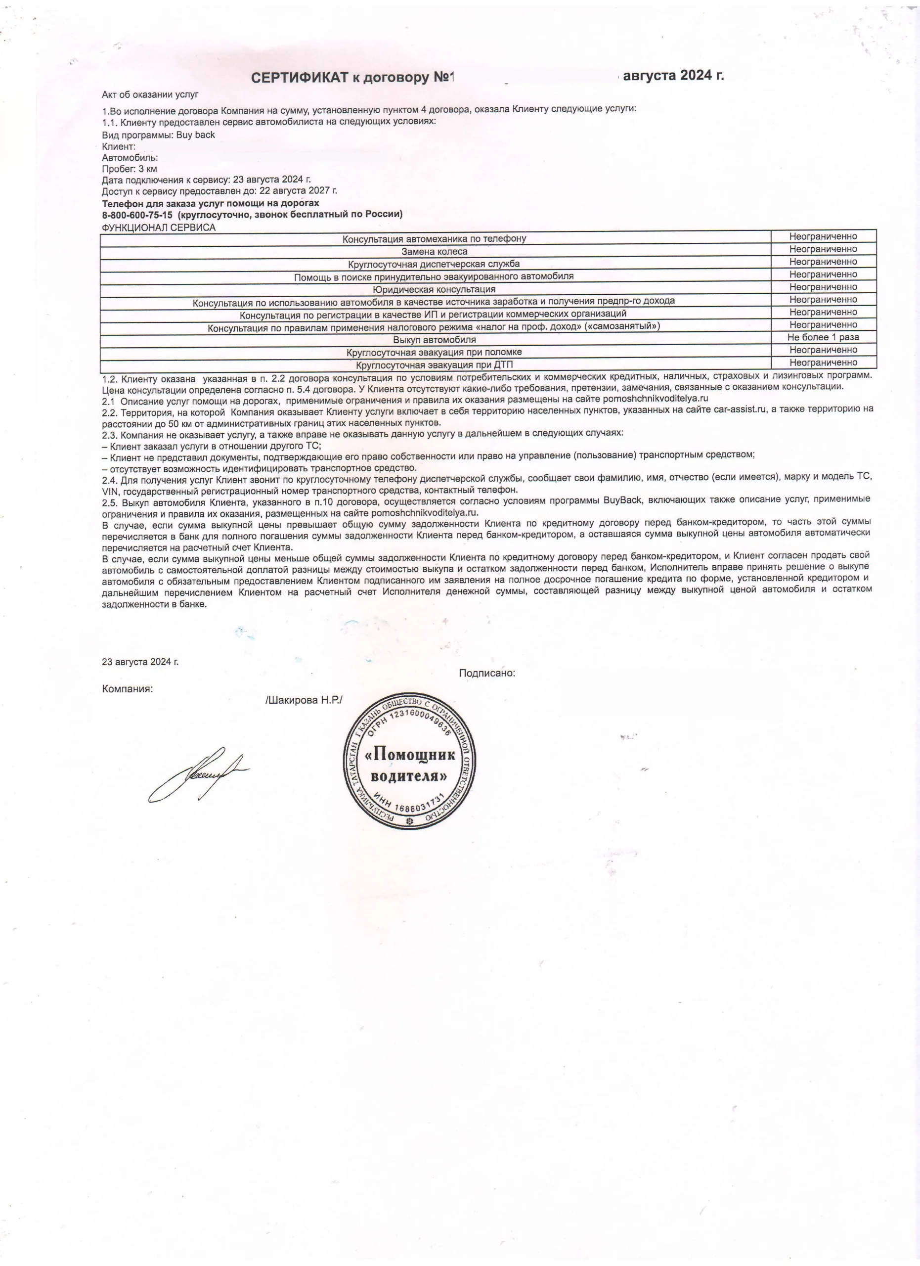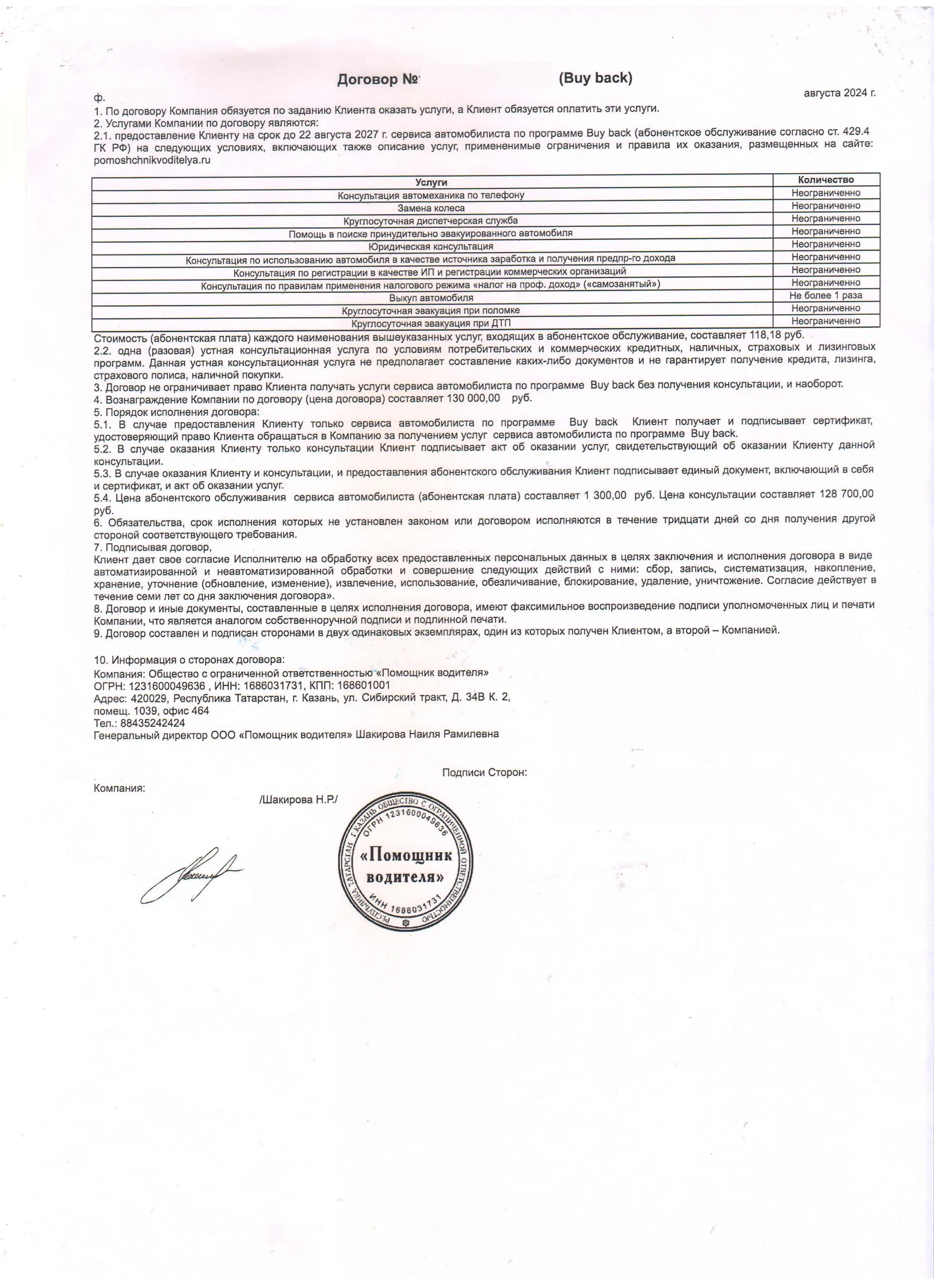 По договору ООО “Помощник Водителя” обязуется оказать услуги помощи на дороге, а также разово устно проконсультировать по условиям потребительских и коммерческих кредитных, наличных, страховых, лизинговых программ. Полный перечень услуг, входящих в программу Buy back, и подробные условия их оказания, размещены на сайте: https://pomoshchnikvoditelya.ru.